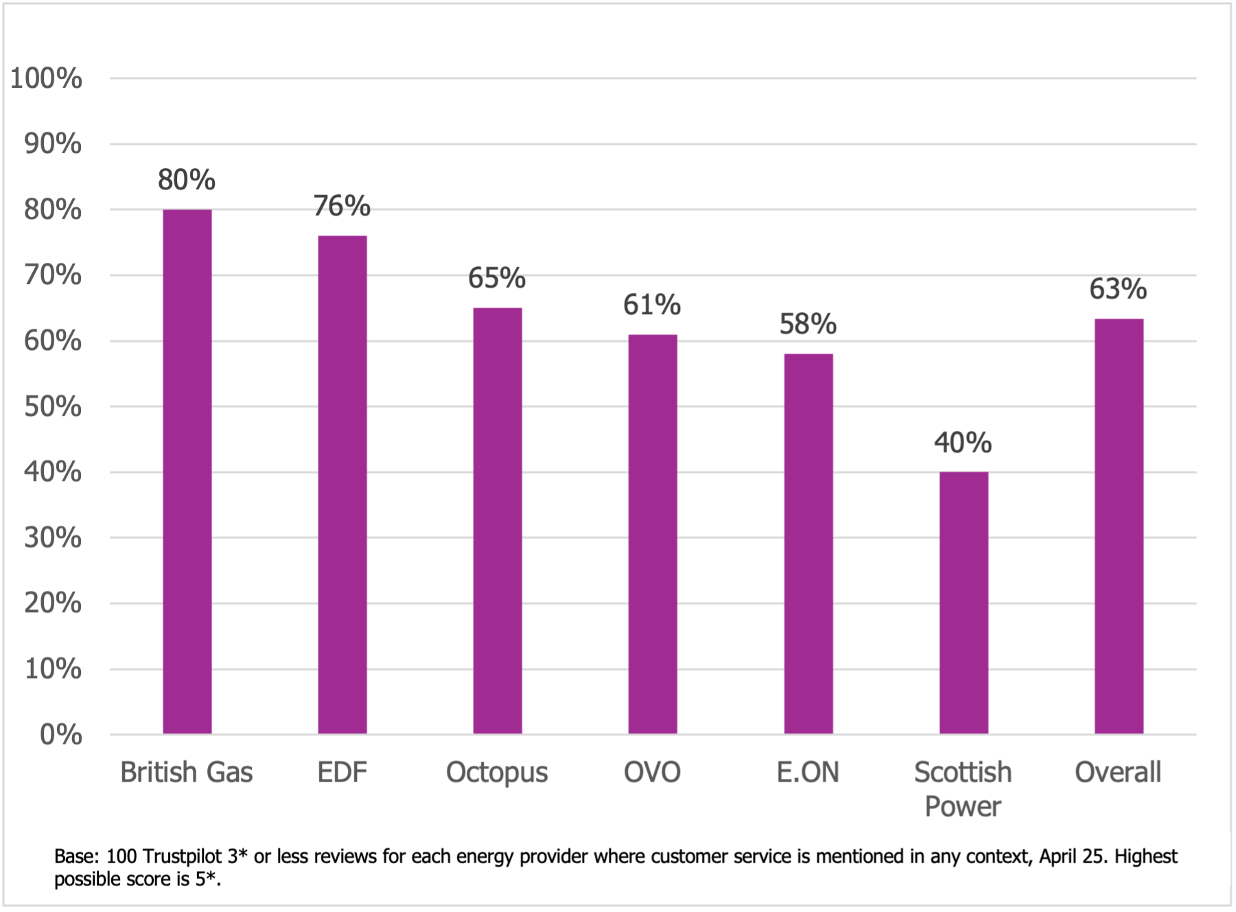 To better understand how central customer service is to the customer experience, we looked at a sample of 600 Trustpilot reviews scored at three stars or lower in April 2025 made up of 100 each from the six major UK energy suppliers. Across the board, 63% of these reviews mentioned customer service directly, underscoring just how important it is for customers.