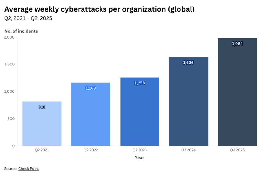 As the diagram from the World Economic Forum, sourcing from Check Point, demonstrates, each year the average weekly cyberattacks per organisation increases, demonstrating that each organisation is at higher risk from attackers.